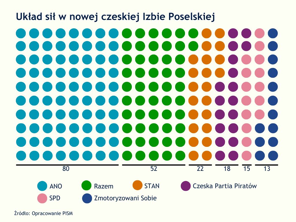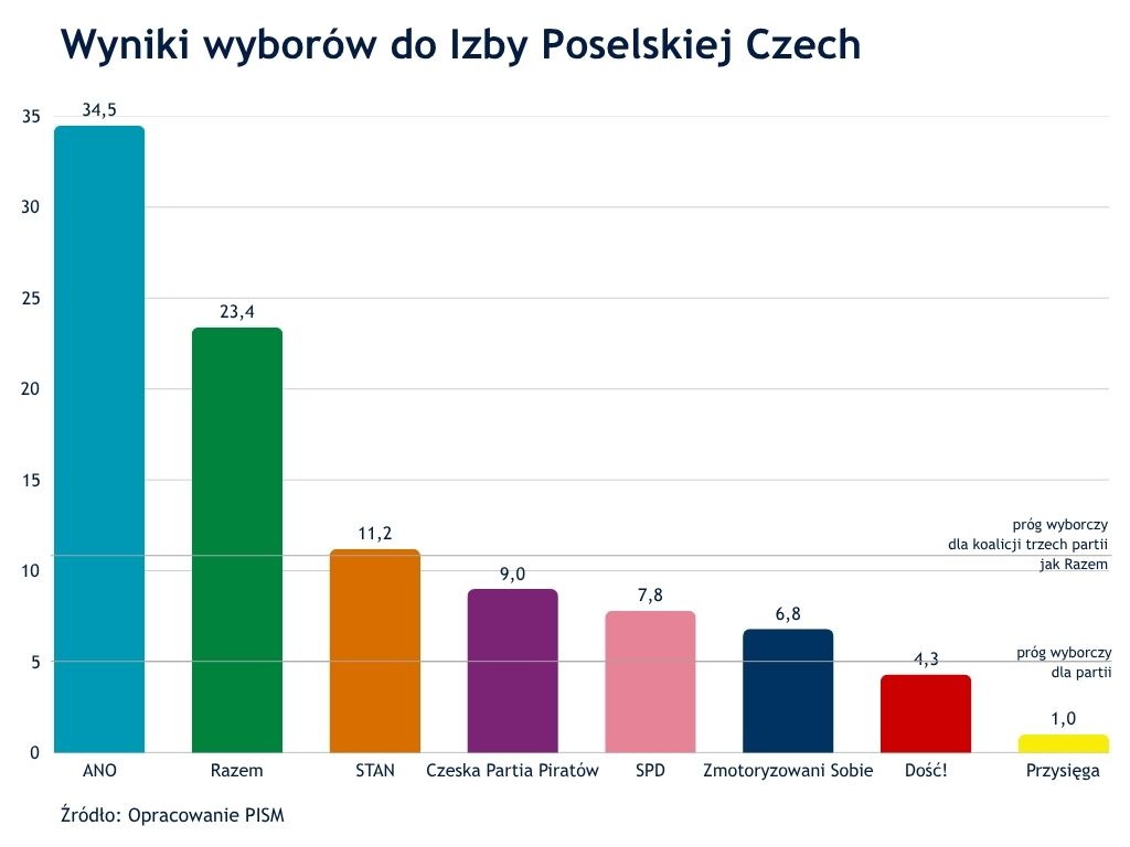 W konsekwencji powyborczych negocjacji powstanie najprawdopodobniej rząd wokół ANO – w koalicji ze zbliżonymi programowo Zmotoryzowanymi Sobie oraz skrajnie prawicową Wolnością i Demokracją Bezpośrednią (partie te zdobyły 108 miejsc w 200-osobowej Izbie Poselskiej) lub w wariancie rządu mniejszościowego. Chociaż najprawdopodobniej dojdzie do intensyfikacji współpracy Czech z Węgrami i ze Słowacją (w wymiarze dwustronnym, a nie w ramach V4), to nie należy spodziewać się prorosyjskiego zwrotu Czech w stylu tych państw. W interesie Rosji jest natomiast postulowane przez Andreja Babiša i jego potencjalnych koalicjantów ograniczanie politycznej i militarnej pomocy dla Ukrainy. W polityce unijnej Czech spodziewane jest nasilenie krytyki funkcjonowania UE, szczególnie jej ekologicznych polityk odzwierciedlonych w perspektywie zakazu sprzedaży nowych samochodów spalinowych od 2035 r. oraz w unijnym systemie handlu emisjami ETS2, który Babiš chce modyfikować przy pomocy m.in. Polski.