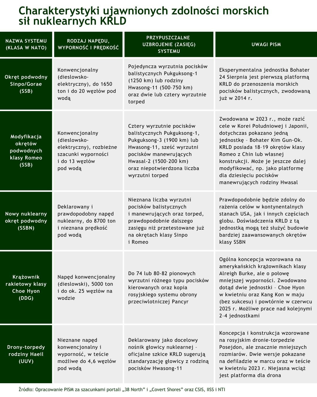 W materiale pokazano prace wykończeniowe nad nowej klasy okrętem podwodnym KRLD z napędem nuklearnym, który rozmiarami i wypornością przekracza wszystkie wcześniej zbudowane przez nią jednostki. Okręt ten pokazano fragmentarycznie jeszcze w marcu br. Zwodowanie go w 2026 r. będzie zasadniczym postępem w realizowanych przez KRLD od ponad dekady projektach morskich platform, które mogą przenosić większą liczbę pocisków, również bardziej zaawansowanych pocisków kierowanych z głowicami konwencjonalnymi i nuklearnymi. Wywiad południowokoreański ocenia, że reaktor, turbinę i system chłodzenia do okrętu dostarczyła Rosja w ramach zacieśnianej od 2022 r. dwustronnej współpracy wojskowej. Warto odnotować, że KRLD w ostatnich 15 latach opanowała kolejne elementy technologii niezbędnych dla budowy wiarygodnych morskich sił odstraszania nuklearnego. Wprawdzie jawne oceny zachodnich wywiadów nie wspominały, że KRLD uzyska takie zdolności w ciągu następnych 10–15 lat, jednak w tym czasie wzrośnie prawdopodobieństwo budowy przez nią małej floty mogącej razić cele w Korei Południowej, Japonii, na Guam i w kontynentalnych USA. Wzmocni to zapewne zainteresowanie obecnej administracji i Kongresu sfinansowaniem i rozbudową nowego systemu obrony przeciwrakietowej – tzw. Złotej Kopuły.