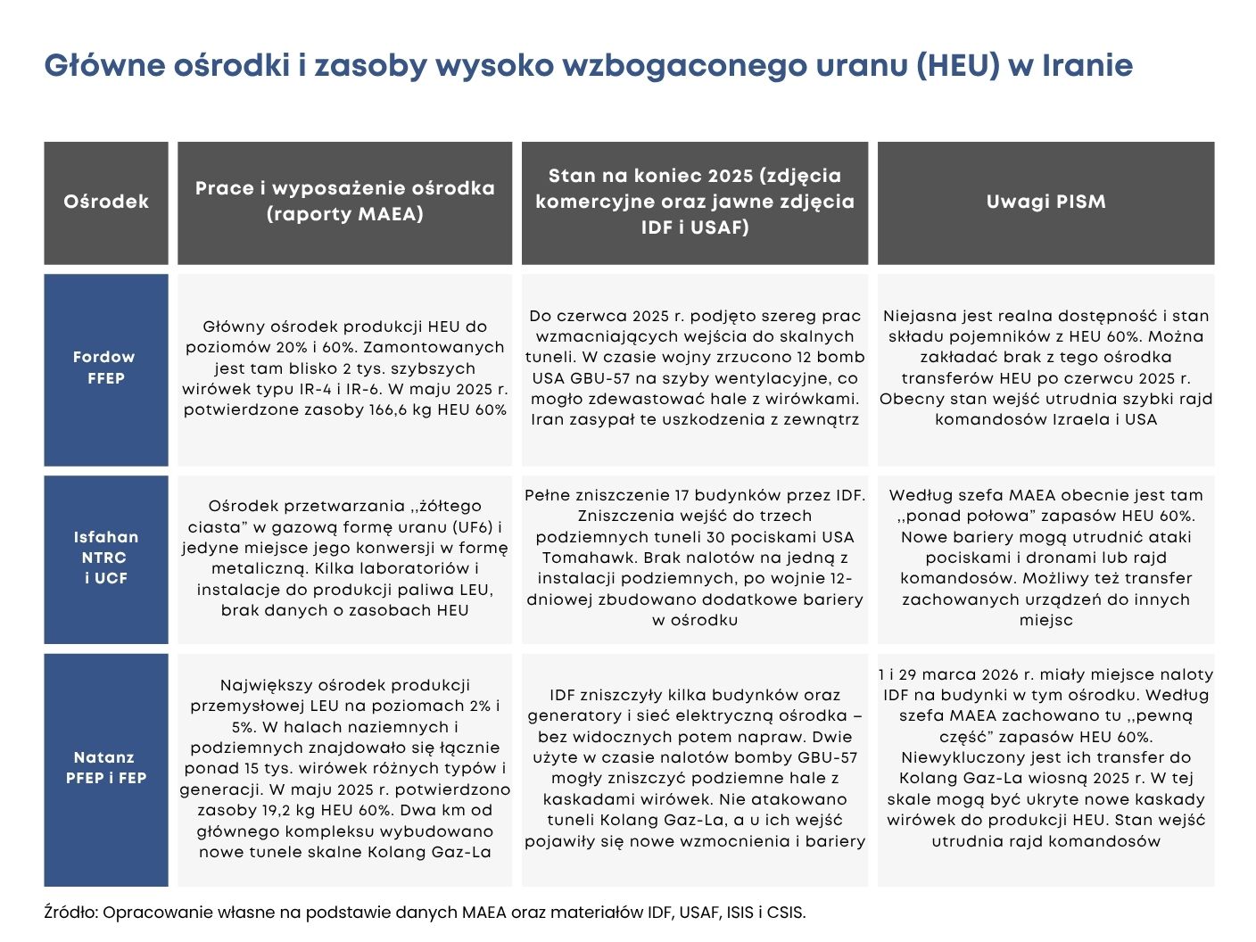 Losy ponad 400 kg irańskiego HEU są przedmiotem sporów. Po atakach z czerwca 2025 r. służby wywiadowcze USA i Izraela oraz MAEA nie potwierdziły publicznie położenia i stanu pojemników z gazowym HEU. Pozarządowi eksperci spekulowali jednak, że większość z nich znajduje się w zasypanych tunelach skalnych ośrodka w Fordow i w mocno uszkodzonych instalacjach w Isfahanie. Równolegle pojawiały się też komentarze, że Iran szybko wzbogaci swój HEU do poziomu uranu bojowego (90%), a wkrótce potem zbuduje improwizowane ładunki lub proste głowice nuklearne. Do marca br. nie pojawiły się jednak żadne zweryfikowane informacje o uruchomieniu przez Iran nowych ośrodków wzbogacania i konwersji HEU w uran bojowy (w formie metalicznej). Spekulacje na temat losów HEU przerwał 9 marca br. szef MAEA Rafael Grossi, który stwierdził, że ponad połowa irańskich zasobów znajduje się w Isfahanie. Wypowiedź Grossiego sugerowała, że pojemniki z Fordow i Natanzu są zniszczone lub trudno dostępne, co wciąż jednak nie dawało pełnego obrazu losów HEU. Było natomiast potwierdzeniem jego obecności w tych samych trzech ośrodkach, w których znajdował się w maju 2025 r. Wraz z dostępnymi zdjęciami satelitarnymi Isfahanu i Natanzu pozwalało też wnioskować, że jak dotąd Iran nie odzyskał ich i nie naruszył do celów wojskowych. Widoczne na zdjęciach prace nad wzmacnianiem ochrony i obrony ośrodków sugerują, że Iran nie spieszył się z odzyskaniem choćby części cennego HEU.