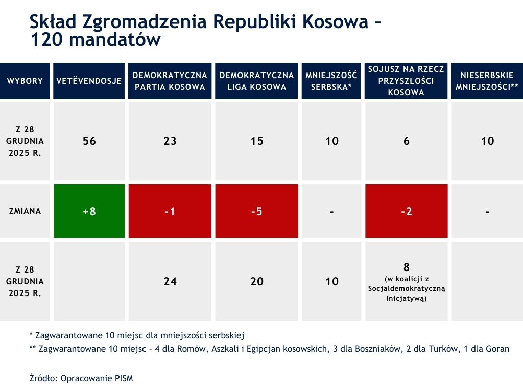 LVV, zdobywając 49% głosów, zwiększyła liczbę mandatów z 48 do 56 w 120-miejscowym Zgromadzeniu. Pozwoli jej to przełamać pat polityczny, który po wyborach z lutego br. uniemożliwiał powołanie rządu i skutkował rozpisaniem nowych wyborów. Sukces zapewniły jej obietnice podwyżek w sektorze publicznym, przeznaczanie 1 mld euro rocznie na inwestycje oraz skuteczna walka z przestępczością zorganizowaną. Zdołała także przerzucić odpowiedzialność za pat w mijającej kadencji na opozycję – główne jej ugrupowania Demokratyczna Partia Kosowa i Demokratyczna Liga Kosowa zdobyły odpowiednio 23 i 15 mandatów (wobec dotychczasowych 24 i 20) – która krytykowała rządy Kurtiego za podsycanie konfliktów z Unią Europejską i z serbską mniejszością w północnym Kosowie. W nowej kadencji opozycja, obawiając się dalszej utraty poparcia, zapewne będzie skłonna współpracować z LVV w kluczowych kwestiach – na początku 2026 r. Zgromadzenie musi ratyfikować wygasające umowy kredytowe z UE i Bankiem Światowym warte 1 mld euro, zaś w kwietniu wybrać prezydenta kraju.