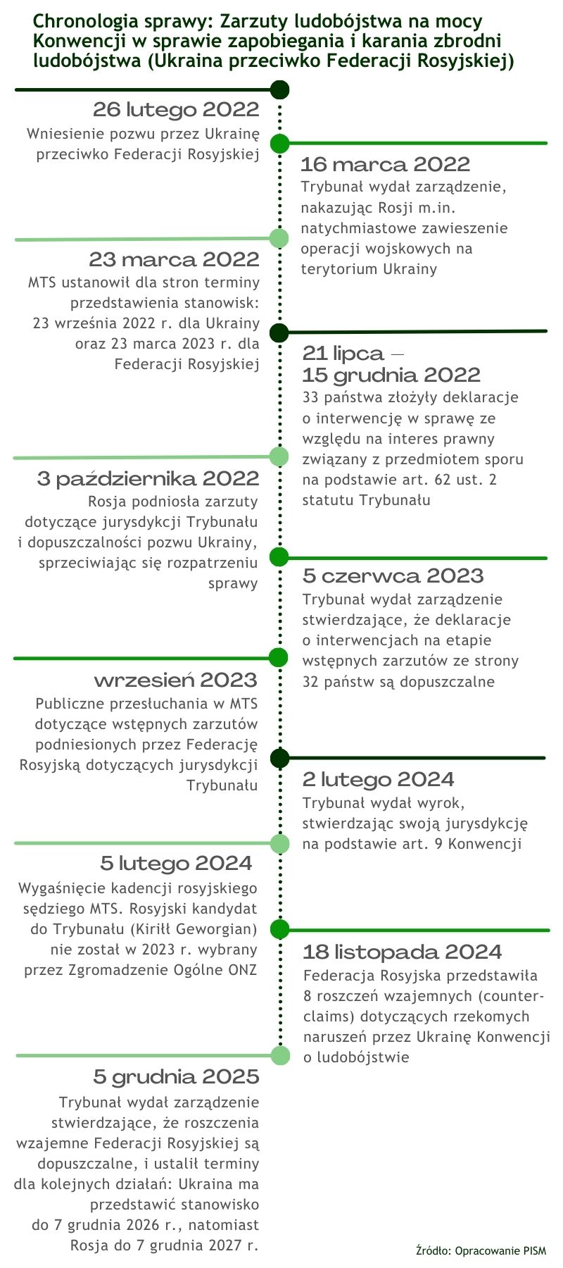 Wbrew tezom rosyjskich mediów grudniowe posiedzenie MTS dotyczyło sprawy wniesionej przez Ukrainę przeciwko Rosji zaraz po inwazji w lutym 2022 r. Zamiarem Ukrainy było zdemaskowanie pretekstu, który Rosja, rozpoczynając zbrojną napaść, przywołała w celu nadania pozorów działania zgodnego z prawem międzynarodowym, czyli rzekomej konieczności obrony ludności Donbasu przed ludobójstwem. Rosja początkowo zlekceważyła to postępowanie, zwłaszcza że MTS niezwykle szybko, już 16 marca 2022 r., nakazał jej w ramach środków zabezpieczających natychmiastowe zawieszenie operacji wojskowych. Solidarna reakcja wielu państw, które przystąpiły do interwencji w sprawie (m.in. Polski), spowodowała zmianę strategii prawnej Rosji. Podjęła się ona obrony, wyznaczając do sprawy sędziego ad hoc. Było to wymuszone dotkliwą porażką w głosowaniu w ONZ w 2023 r. – rosyjski kandydat przegrał, co spowodowało, że po raz pierwszy w historii Rosja nie ma swojego sędziego w MTS. Ponadto jej władze w celu przedłużenia postępowania skorzystały z uprawnień proceduralnych w sprawie i powtórzyły propagandowe zarzuty z 2022 r., do których muszą się odnieść jego uczestnicy. Przystąpienie licznego grona państw do sprawy pokazało, że w przypadku obrony prawa międzynarodowego solidarność ma kluczowe znaczenie i jest to czynnik, z którym muszą się liczyć nawet kraje przypisujące sobie rolę mocarstw.