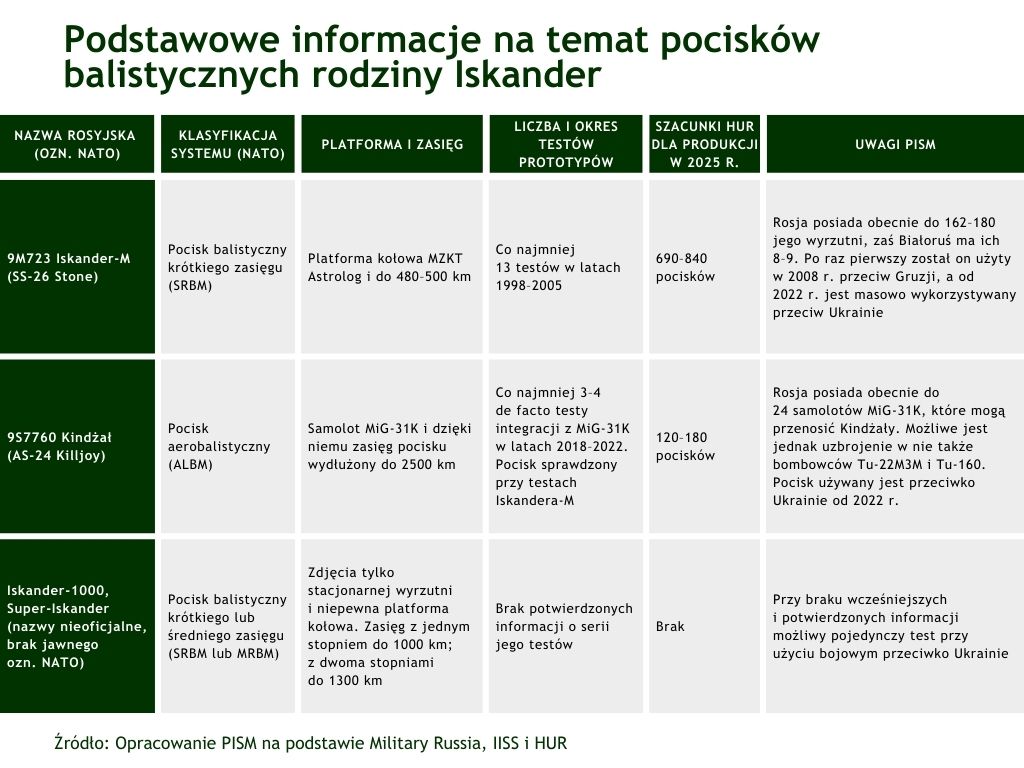 Pociski rodziny Iskander-M/Kindżał opracowane przez koncern KBM są masowo używane przeciwko Ukrainie dzięki ich stale rosnącej produkcji (zob. Tabela). Według władz Ukrainy nowego prototypu tego pocisku użyto w grudniu 2025 r. na dystansie 800 km, tj. o 300 km dalszym niż standardowego Iskandera. Wcześniej eksperci spekulowali tylko na temat projektu Iskandera-1000. W maju 2024 r. potwierdzeniem prac były niskiej jakości zdjęcia wyrzutni z pociskiem na poligonie Kapustin Jar. W przeciwieństwie do nagłośnionych przez władze Rosji uderzeń pociskiem Oriesznik (Rubież) tym razem temat pojawił się tylko na kilku blogach i forach eksperckich. Rosja od ponad dekady rozwija nowe pociski balistyczne i manewrujące do rażenia celów w całej Europie. Prace te mogły przyspieszyć, gdy Ukraina wykazała bardzo wysoką (70–80%) skuteczność przechwyceń pocisków manewrujących Kalibr i Ch-101. Przy rozwoju kolejnego pocisku w oparciu o Iskandera-M możliwe są dwa sposoby zwiększenia jego zasięgu. W pierwszym i bardziej prawdopodobnym konieczne będzie zaadaptowanie jego jednostopniowej konstrukcji do większego o 10–15% baku paliwa rakietowego z mniejszą i lżejszą głowicą, co dałoby zasięg do 1000 km. Drugim i kosztowniejszym rozwiązaniem byłoby opracowanie dwustopniowego pocisku ze sprawdzoną już głowicą o masie 500 kg i zasięgu nawet do 1300 km. Druga opcja wymaga jednak osobnej linii produkcyjnej oraz nowej i większej wyrzutni. Nawet przy obniżonych wymaganiach Rosji taki dwustopniowy pocisk wymaga też kilkunastu testów, a jego użycie bojowe wyklucza zebranie przez KBM pełnych danych o przebiegu lotu, celności i eksplozji głowicy. Tak jak deklarowane przez Rosję rozmieszczenie Oriesznika na Białorusi, testy Iskandera-1000 wymagają więc weryfikacji środkami wywiadu, a następnie ewentualnego uwzględnienia w planach obrony przeciwrakietowej wschodniej flanki NATO.