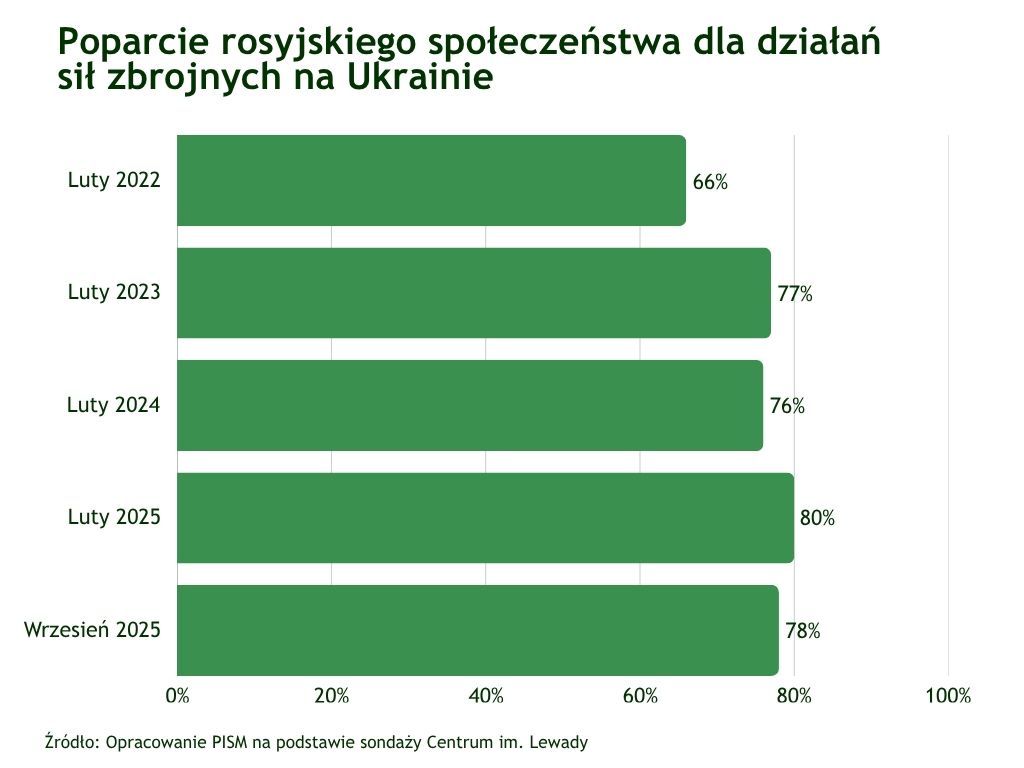 Badania socjologiczne prowadzone w Rosji pokazują utrzymujące się poparcie dla działań zbrojnych na Ukrainie. Postępująca militaryzacja rosyjskiego społeczeństwa sprzyja agresywnej polityce władz tego państwa.