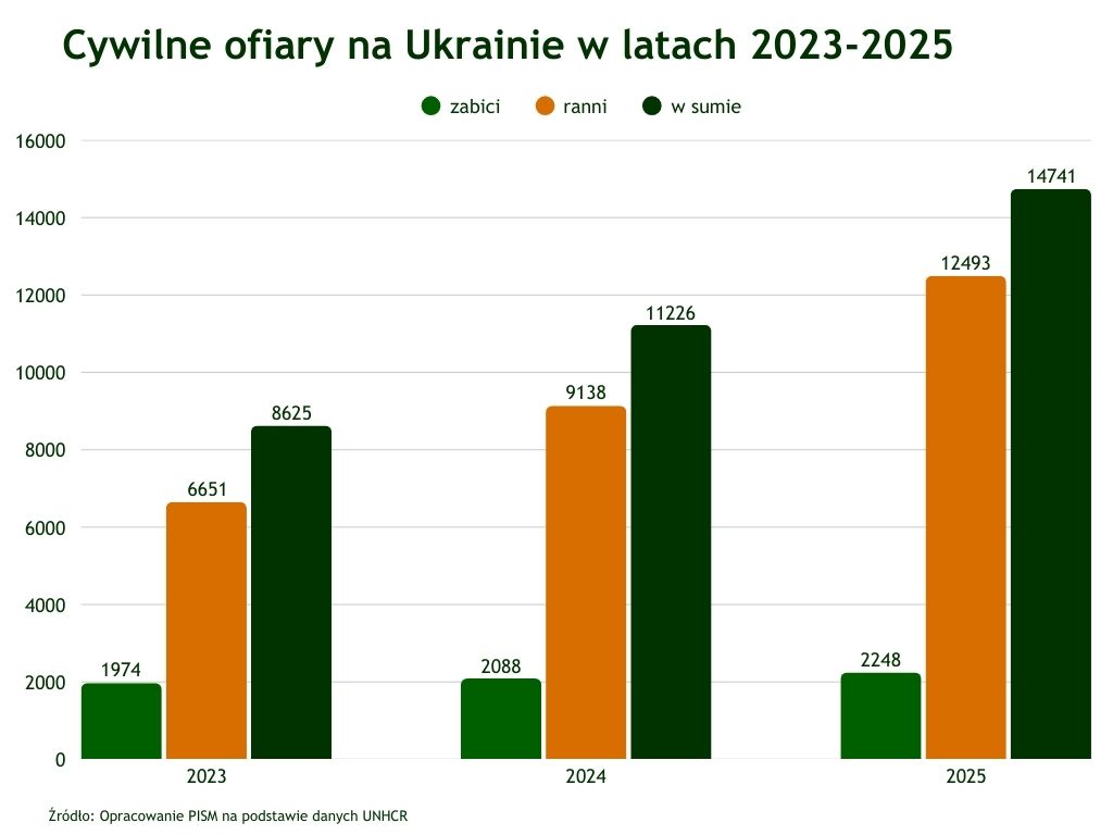 Jak szacuje brytyjska organizacja Action on Armed Violence zajmująca się rejestrowaniem, badaniem i rozpowszechnianiem dowodów przemocy zbrojnej wobec ludności cywilnej na świecie, w 2025 r. liczba ofiar cywilnych wśród ludności ukraińskiej wzrosła o 26% w porównaniu z 2024 r. Średnia liczba cywilów zabitych lub rannych w wyniku jednego ataku wzrosła o 33% w ciągu roku, ze średnio 3,6 ofiary w 2024 r. do 4,8 w 2025 r. Jak szacuje UNHCR, w ub.r. na Ukrainie zginęło 2248 cywilów, a 12 493 zostało rannych. Stanowi to wzrost o 31% w porównaniu z 2024 r. (2088 zabitych, 9138 rannych) i o 70% w porównaniu z 2023 r. (1974 zabitych, 6651 rannych). 67% ofiar cywilnych (122 zabitych, 571 rannych) znajdowało się w pobliżu linii frontu. Za największą liczbę ofiar na tych terenach odpowiadały drony, ataki artyleryjskie oraz bombardowania. W styczniu 2026 r. zginęło co najmniej 161 osób, a 757 zostało rannych, spośród których 39% (54 zabitych, 305 rannych) znajdowało się w ośrodkach miejskich oddalonych od linii frontu, a atakowanych przez rosyjskie pociski i drony. Działania Rosji jasno wskazują na chęć systemowego wyniszczania Ukrainy i powodowania jak największych strat wśród ludności tego państwa. Tym samym nadal kluczowe znaczenie mają zachodnie dostawy systemów umożliwiających efektywną obronę powietrzną.