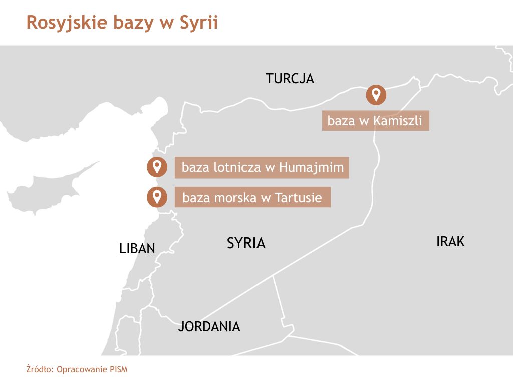 W styczniu wojska rządowe Syrii zajęły większość północnych prowincji kraju, zaś Asz-Szara bliski jest włączenia kurdyjskich Syryjskich Sił Demokratycznych w struktury państwa. Chce również zatrzymać tworzenie ruchów separatystycznych wśród społeczności alawickiej, częściowo finansowanych przez otoczenie prezydenta Baszara al-Asada, który mieszka obecnie w Moskwie. Od przejęcia władzy w grudniu 2024 r. Asz-Szara próbuje wymóc na Putinie wydanie obalonego poprzednika. Rosja z kolei chce zachować lotnicze bazy wojskowe w Kamiszli i Humajmim oraz morską w Tartusie, które umożliwiają jej utrzymanie wpływów wojskowych i gospodarczych w regionie Bliskiego Wschodu i Afryki Północnej oraz na Morzu Śródziemnym. Putin, pragnąc zachować status Rosji jako bezpiecznego azylu dla obalonych dyktatorów, zamiast wydania Asada oferuje dostawy żywności i pomoc w odbudowie Syrii. Pod koniec stycznia br. media informowały o wycofywaniu się rosyjskich sił z Kamiszli, ale nie zostało to oficjalnie potwierdzone. Prawdopodobnie Putin i Asz-Szara nie doszli do porozumienia, które wypracowują robocze delegacje syryjsko-rosyjskie. Dlatego należy spodziewać się kolejnych kontaktów i spotkań.