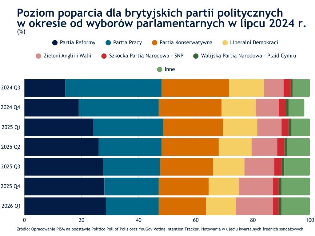 Prowadząca obecnie w sondażach z poparciem ok. 30% prawicowo-populistyczna Partia Reformy pod przywództwem Nigela Farage’a wykorzystuje transfery w partiach establishmentowych do budowy swojej wiarygodności jako siły zdolnej do rządzenia państwem. Po raz pierwszy w historii brytyjskiej demokracji kryzys jednego z dwóch głównych ugrupowań zbiega się z kryzysem drugiego (poparcie po ok. 18%). Od wyborów w lipcu 2024 r. Partia Pracy straciła połowę poparcia. Napięcia w tym ugrupowaniu uwypukliły się przed nadchodzącymi wyborami uzupełniającymi w okręgu Gorton, zarządzonymi po skazaniu posła laburzystowskiego za pobicie wyborcy. Władze partii zablokowały kandydaturę Andy’ego Burnhama, popularnego burmistrza Manchesteru, obawiając się uruchomienia przez niego procedury zmiany przywódcy partii po uzyskaniu mandatu posła. W efekcie kampania w okręgu obsadzanym przez laburzystów od 1935 r. została zdominowana przez partie Reformy i Zielonych. Zwycięstwo dowolnego z tych ugrupowań pogłębi postępujący kryzys obu tradycyjnie dominujących ugrupowań przed nadchodzącymi wyborami samorządowymi w Anglii i krajowymi w Walii i Szkocji 7 maja br.