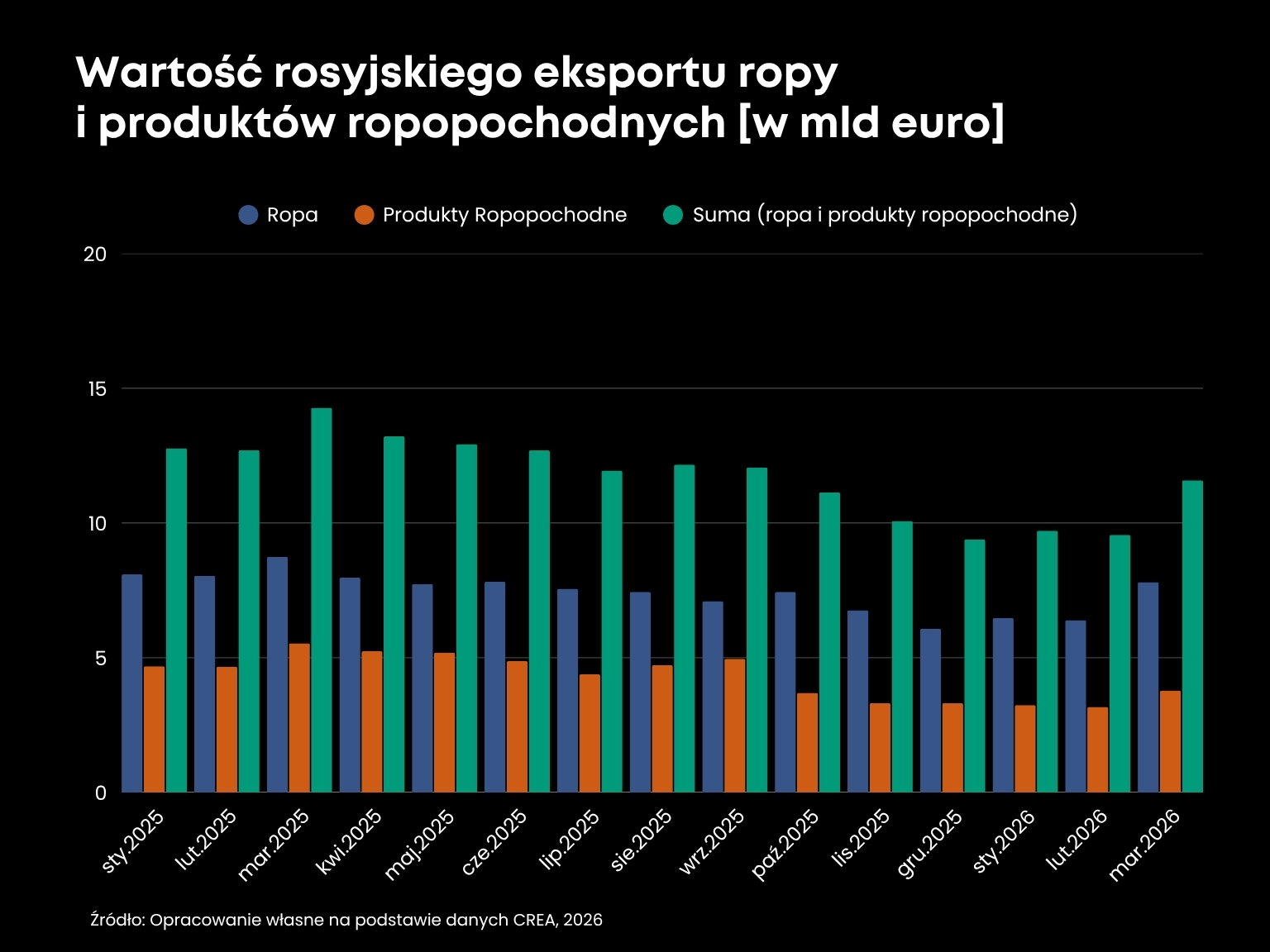 Administracja USA nie przedłużyła czasowej licencji nr 134, która do 11 kwietnia pozwalała na dostawy rosyjskiej ropy i produktów naftowych, załadowanych na statki przed wejściem w życie zwolnienia. Decyzja zapadła mimo działań dyplomatycznych Rosji — specjalny wysłannik Kiriłł Dmitrijew odbył 9 kwietnia rozmowy z przedstawicielami administracji prezydenta Donalda Trumpa. Według mediów o przedłużenie licencji wnioskowały też niektóre państwa azjatyckie, m.in. Indie i Filipiny, które importują rosyjski surowiec. Marcowe złagodzenie sankcji nie obniżyło cen ropy, choć taki był oficjalny cel USA, za to przyniosło Rosji duże korzyści finansowe. Według danych CREA rosyjskie przychody z podatku od sprzedaży ropy i produktów ropopochodnych za marzec wzrosły o 114% m/m, osiągając 7,4 mld euro, a łączna wartość eksportu surowców wyniosła 11,6 mld euro. Dyskonto ropy Urals zmniejszyło się o połowę względem lutego, do średnio 6,4 dol. za baryłkę poniżej Brent. Powrót do pełnych sankcji oznacza konieczność oferowania przez Rosję większych zniżek cenowych, co ograniczy jej potencjalne zyski. Jednocześnie, dopóki trwa konflikt w rejonie cieśniny Ormuz, azjatyccy odbiorcy nadal będą kupować rosyjską ropę z powodu niedoborów.