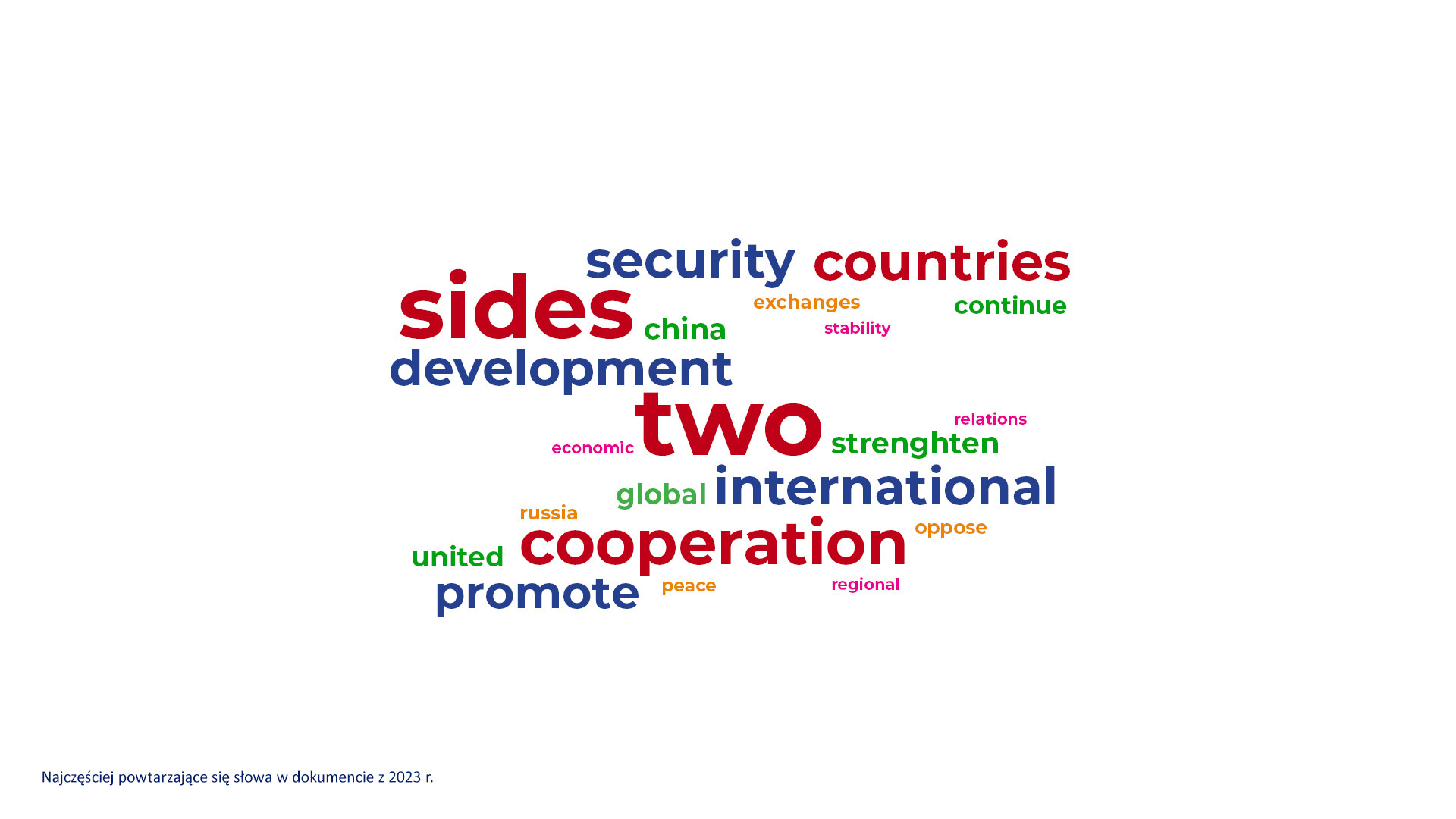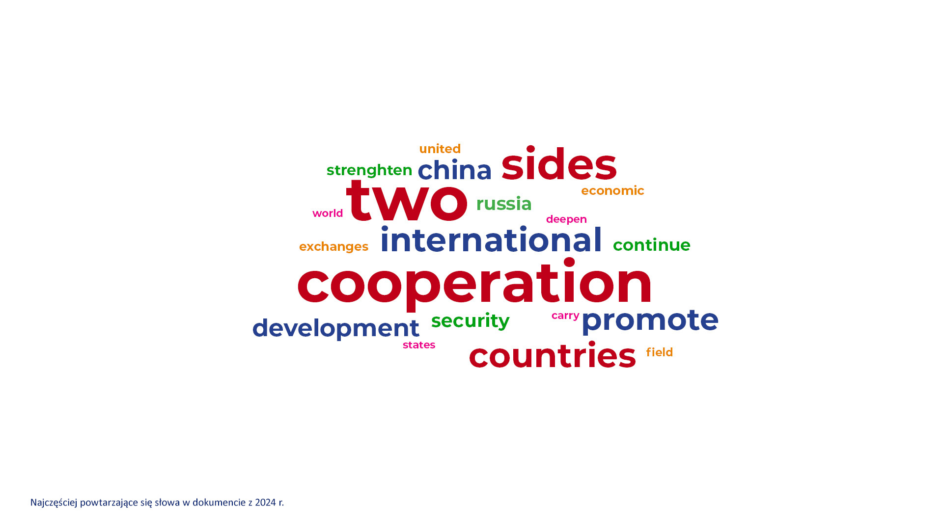 Dynamikę zmian zachodzących w relacjach chińsko-rosyjskich odzwierciedla analiza słów użytych w dokumentach z ostatnich lat. Dominują w nich określenia odnoszące się do koordynacji polityki Chin i Rosji („międzynarodowy” „współpraca”, „dwa państwa”), a także wskazujące najważniejsze obszary kooperacji („bezpieczeństwo”, „rozwój”). Częściej niż Rosję w tekstach wymienia się z nazwy Chiny. Jest to sygnałem przewagi Chińskiej Republiki Ludowej w tej relacji, zarówno pod kątem najpierw zdolności do narzucania swojej wizji tej współpracy, a później realizacji politycznych planów, jak i podzielanej przez oba państwa wizji stosunków międzynarodowych, w których kluczowym zagrożeniem dla obu reżimów jest działanie Zachodu (czyli USA i ich partnerów). Tę dominację Chin odzwierciedlają też częste stosowanie retoryki ChRL i liczne odniesienia do chińskich inicjatyw politycznych.