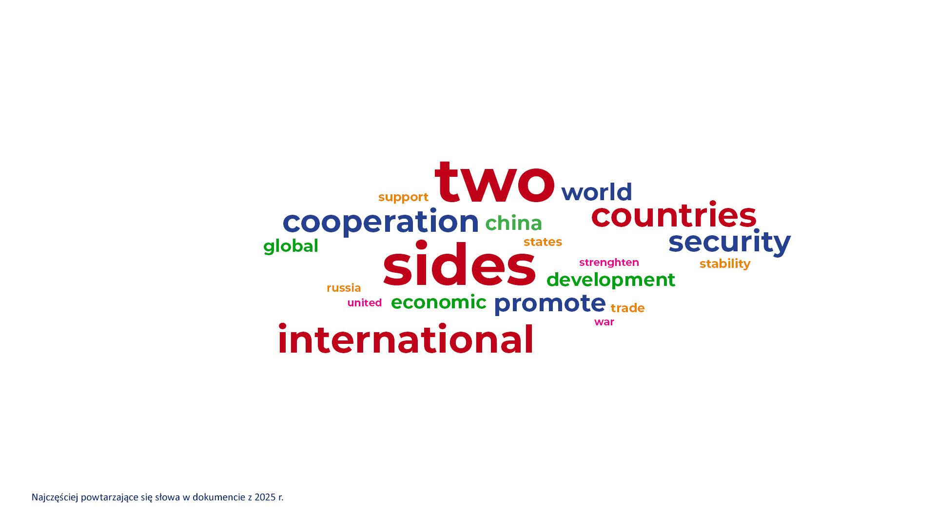 W ostatnich latach treść dokumentów i coraz szerszy zakres uwzględnianych w nich tematów, a w 2025 r. także większa liczba przyjętych oświadczeń, pokazują duże znaczenie rosyjskiej agresji na Ukrainę dla polityki ChRL i jej relacji z Federacją Rosyjską. Od tego momentu wyraźna jest intensyfikacja tych stosunków, a po jednej i drugiej stronie – przekonanie o konieczności wzmacniania relacji. Dokumenty obrazują szczególny charakter strategicznego partnerstwa Chin i Rosji. Nie wyklucza ono istnienia różnic w podejściu obu państw do poszczególnych spraw. Silniejsza od kwestii spornych jest jednak widoczna w dokumentach nieufność wobec Zachodu – poczucie zagrożenia władzy reżimów w obu państwach oraz wynikająca z tego strategiczna, żywotna konieczność konfrontacji z USA i ich partnerami spajają Chiny i Rosję. Różnice w podejściu do poszczególnych zagadnień politycznych są przez oba państwa traktowane jako normalne i dopóki będą w nich rządzić obecne reżimy, dopóty nie staną się przeszkodą w strategicznej współpracy.