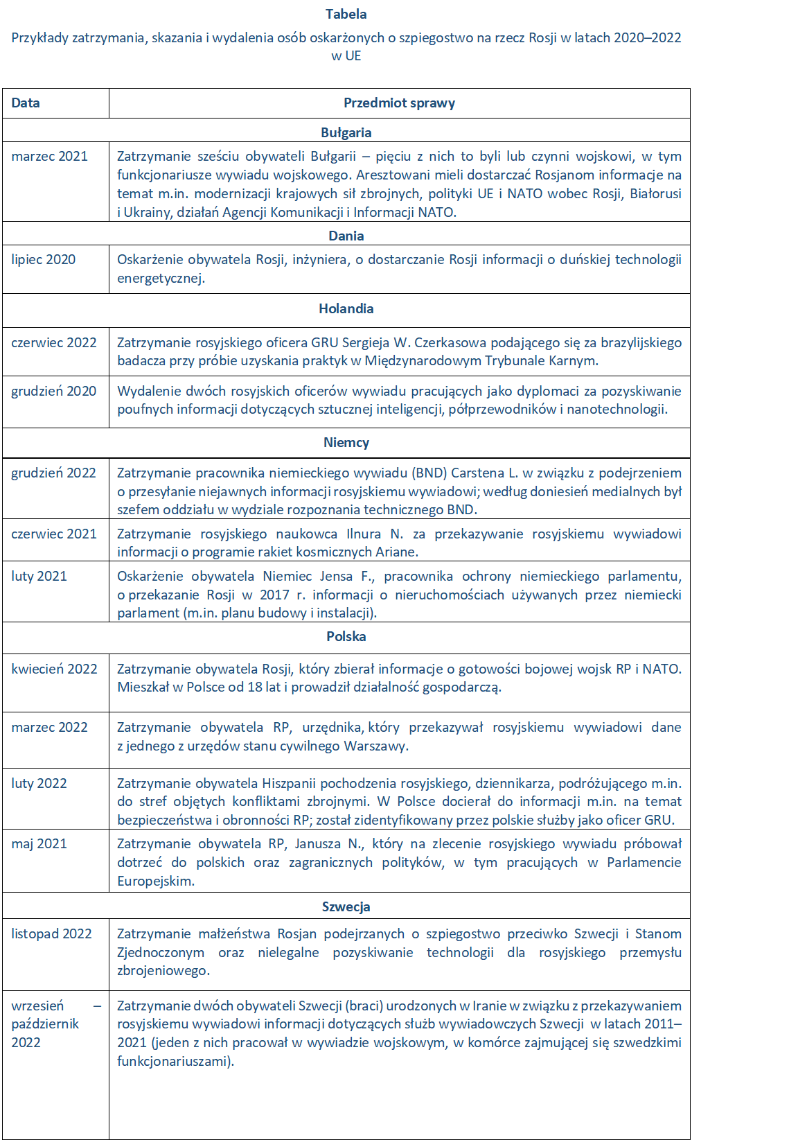 Dotychczas wykryte przypadki rosyjskiego szpiegostwa w UE potwierdzają, że Rosji udaje się lokować szpiegów w strategicznie istotnych komórkach instytucji państw członkowskich (patrz tabela). Mimo zmniejszenia w 2022 r. liczby oficerów wywiadu pracujących pod przykryciem dyplomatycznym Rosja – ze względu m.in. na różną politykę państw członkowskich – nadal ma duży potencjał prowadzenia działań szpiegowskich. Biorąc pod uwagę długotrwały charakter agresji przeciw Ukrainie i międzynarodowe sankcje, aktywność Rosji będzie się nasilać. By jej przeciwdziałać, konieczne jest m.in. wzmocnienie zdolności kontrwywiadowczych w UE. W celu zwiększenia publicznej świadomości na temat skali szpiegostwa w UE dokonywanego przez państwa trzecie, w tym Rosję, Europejska Służba Działań Zewnętrznych mogłaby konsolidować i udostępniać w postaci regularnych raportów informacje na temat takich incydentów i toczących się postępowań, wskazując przedmiot zainteresowania obcego wywiadu i straty poniesione przez UE. W przypadkach identyfikowania kolejnych rosyjskich dyplomatów jako szpiegów Polska mogłaby także zachęcać państwa UE do koordynacji akcji ich wydalania z terytorium Unii.