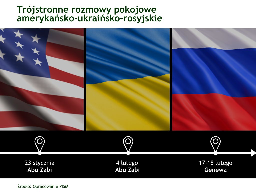 W dniach 17–18 lutego br. w Genewie odbyła się trzecia runda trójstronnych pertraktacji amerykańsko-ukraińsko-rosyjskich, która podobnie jak poprzednie nie przyniosła rezultatów. Jak podkreślił Wołodymyr Zełenski, w ramach wojskowej części negocjacji strony rozmawiały m.in. o sposobie funkcjonowania misji monitorującej zawieszenie broni, w której Amerykanie mieliby mieć znaczący udział, o ile zapadnie polityczna decyzja o zakończeniu walk. Nadal jednak najważniejszymi problemami pozostają kwestie oddania Rosji przez Ukrainę kontrolowanej przez siebie części Donbasu oraz przyszłe gwarancje bezpieczeństwa dla państwa ukraińskiego. Ukraina wyraża gotowość do rozmów w sprawie terytoriów (padła propozycja, aby np. zostały one zdemilitaryzowane), ale pod warunkiem otrzymania wiążących gwarancji bezpieczeństwa od członków NATO, m.in. zakładających obecność wojskową na ukraińskim terytorium kontyngentów z części państw Sojuszu. Jak dotąd Rosja nie wyraziła żadnej woli kompromisu i podkreśla, że zakończy działania zbrojne jedynie pod warunkiem realizacji jej postulatów. Wśród swoich żądań wymienia też kwestie statusu języka rosyjskiego w Ukrainie oraz funkcjonowania tam Rosyjskiej Cerkwii Prawosławnej. Nadal także oczekuje od NATO gwarancji, że Sojusz nie będzie się rozszerzał. Kolejna runda rozmów ma również odbyć się w Genewie, jednak nie należy spodziewać się przełomu w negocjacjach.