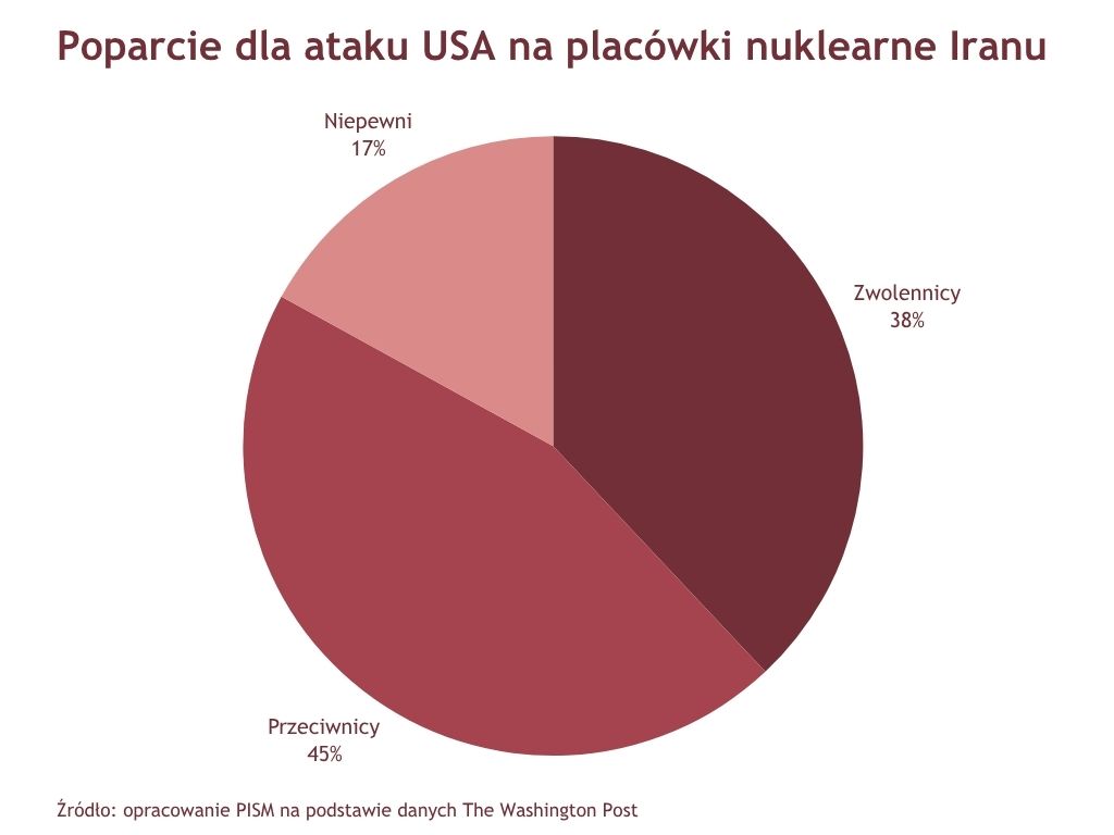 Decyzja prezydenta Donalda Trumpa stoi w sprzeczności z jego deklarowaną polityką nieinterwencjonizmu, szczególnie unikania zaangażowania w nowe wojny. Atak na Iran spotkał się z natychmiastową reakcją członków Kongresu, nie tylko Demokratów, ale także części polityków Partii Republikańskiej, z uwagi na brak konsultacji z parlamentem. Jednak znacząca większość Republikanów, którzy sprawują kontrolę nad obiema izbami Kongresu, wsparła decyzję i działania Trumpa, co sprawia, że wtórne działania władzy ustawodawczej są mało prawdopodobne. Wyłom części środowiska MAGA, która zdecydowanie sprzeciwia się zaangażowaniu militarnemu USA w konflikty – zwłaszcza te, które wiążą się z bezpośrednim zagrożeniem dla Stanów Zjednoczonych – może istotnie wpływać na kolejne decyzje administracji Trumpa dotyczące wykorzystania amerykańskich wojsk na świecie. Jednocześnie w środowisku tym narasta przekonanie, że rząd Benjamina Netanjahu podżega administrację Trumpa do udziału w izraelskich działaniach zbrojnych na Bliskim Wschodzie. Na postawę izolacjonistyczną amerykańskich polityków będzie wpływać opinia publiczna, która zgodnie z badaniami wyraża obawę przed zaognieniem się konfliktu, a co za tym idzie – zaangażowaniem USA, i nie zgadza się z decyzją o użyciu siły.