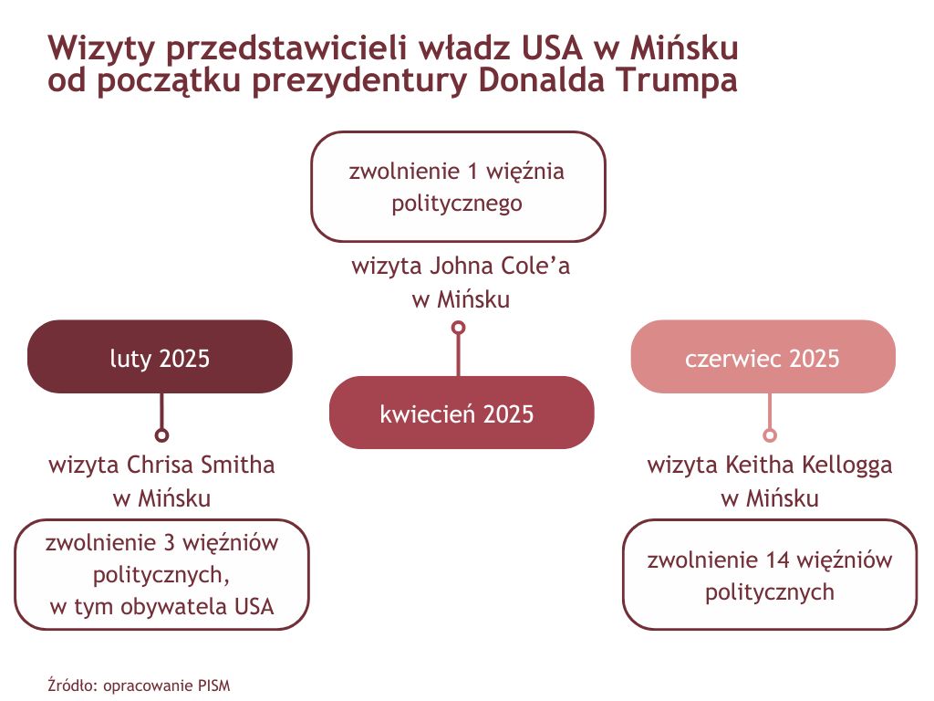 Wizyta Kellogga w Mińsku i jego spotkanie z Łukaszenką wskazują na możliwy powrót USA do polityki postrzegania Białorusi jako istotnego państwa w regionie, realizowanej za pierwszej kadencji Donalda Trumpa. Celem wizyty była potrzeba zaangażowania Białorusi w ukraiński proces pokojowy, który w ostatnich tygodniach znalazł się w impasie. USA liczą, że Łukaszenka będzie w stanie wykorzystać swoje wcześniejsze doświadczenie w prowadzeniu negocjacji między Rosją a Ukrainą. Wśród uwolnionych i przekazanych do Wilna więźniów znalazł się Siarhiej Cichanouski, mąż liderki białoruskiej opozycji, co najpewniej było jednym z najważniejszych warunków postawionych przez USA przed wizytą Kellogga. Nie można też wykluczyć, że jednym z tematów rozmów był kanał porozumienia na poziomie służb obu państw, gdyż w spotkaniu wziął udział Iwan Tertel – szef KGB. Choć obie strony mogą być zainteresowane poprawą stosunków wzajemnych, białoruskie władze będą miały w tym zakresie ograniczone możliwości ze względu na postępujące od 2020 r. uzależnienie od Rosji. Nie należy też liczyć, że Białoruś zmieni swoją politykę względem należących do NATO państw sąsiednich, co oznacza utrzymanie wrogich działań hybrydowych.