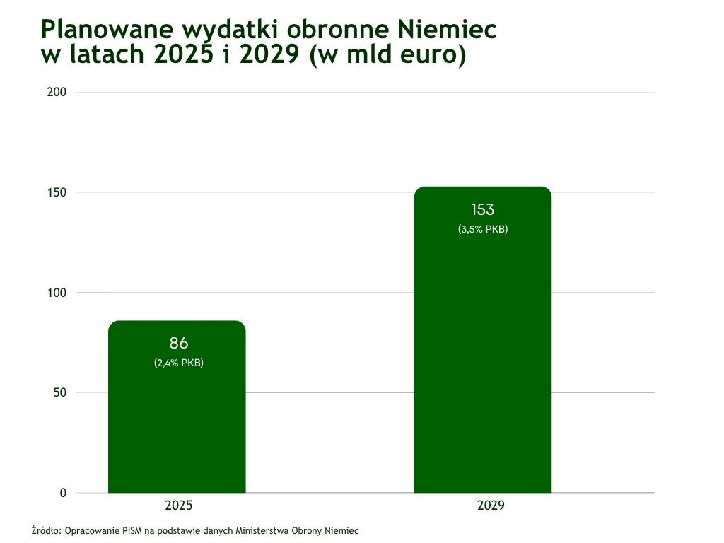 Niemcy planują zwiększenie liczebności sił zbrojnych o 1/3 (do ok. 240 tys. żołnierzy), a także zakupy m.in. ok. 1000 czołgów i do 2500 pojazdów opancerzonych. Ma to być możliwe dzięki wprowadzonemu w marcu br. tzw. pakietowi finansowemu, którego elementem jest zliberalizowanie zasad zaciągania zadłużenia na celem obronne. Niemcy mają w br. wydać na obronność 2,4% PKB, a w 2029 r. osiągnąć pułap 3,5%. Plany te wpisują się w postanowienia szczytu NATO w Hadze z czerwca br., a także są sygnałem wobec administracji prezydenta USA Donalda Trumpa. Niemcy chcą przekonać ją do podtrzymania amerykańskiego zaangażowania wojskowego w Sojuszu, wskazując, że w ciągu dekady będą przejmowały większą odpowiedzialność za bezpieczeństwo Europy. Rząd kanclerza Friedricha Merza tłumaczy zapowiedzi rozbudowy Bundeswehry potrzebą wzmocnienia odstraszania Rosji, którą uznaje za główne zagrożenie dla europejskiego bezpieczeństwa. Ponadto plany te odpowiadają interesom niemieckiego przemysłu zbrojeniowego i mają stanowić impuls dla znajdującej się w stagnacji niemieckiej gospodarki. Rząd Merza liczy, że zakupy nowego uzbrojenia od niemieckich firm przyniosą wzrost PKB o ok. 0,5 pkt proc.