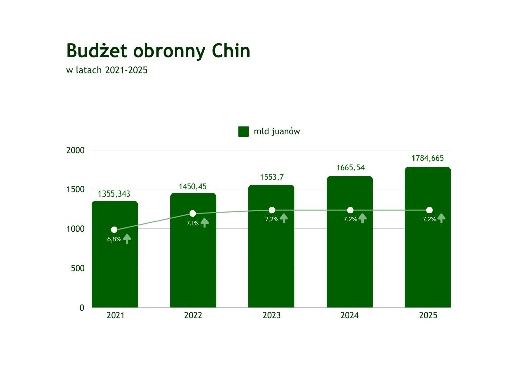 W Chinach od ponad dekady utrzymuje się tendencja do zwiększania wydatków na obronność średnio o ok. 6% rocznie. Wydatki rosną, mimo że wzrost gospodarczy wyhamowuje. Chociaż w odniesieniu do chińskiego PKB ich wysokość nie przekracza 1,5%, potencjał obronny jest wzmacniany także na inne sposoby. Dodatkowe finansowanie obejmuje np. wywiad, rozwój technologii wojskowych, aparat bezpieczeństwa wewnętrznego (tzw. Ludową Policję Zbrojną) czy np. lokalne milicje rybackie, które mogą być wykorzystywane do ograniczania swobody żeglugi na wodach międzynarodowych i obszarach spornych. Całkowity budżet wojskowy ChRL może być więc nawet o 40% większy. Jego coroczny wzrost ma rozwijać potencjał chińskiej armii, co w połączeniu ze zmianami personalnymi i strukturalnymi oraz zwiększeniem dyscypliny poprawi możliwości jej działania w kontekście ewentualnego przejęcia Tajwanu i konfliktu z USA. Zwiększa to także zdolność Chin do kontrolowania morskich szlaków komunikacyjnych, a także do wywierania presji militarnej i politycznej w Azji oraz w innych regionach. Priorytetem ChRL jest m.in. rozbudowa marynarki wojennej (w tym wyposażenia lotniskowców), a także arsenału nuklearnego, w tym okrętów podwodnych zdolnych do przenoszenia głowic jądrowych. W tym ostatnim obszarze Chiny współpracują z Rosją, a wzmacnianie potencjału jądrowego przez oba państwa może w perspektywie kilku lat stanowić wyzwanie dla wiarygodności potencjału nuklearnego odstraszania USA.