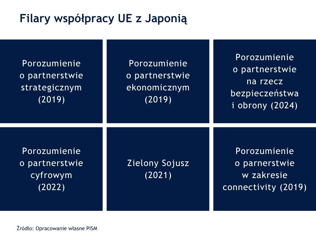 Spotkanie przewodniczących António Costy i Ursuli von der Leyen z premierem Ishibą Shigeru służyło pogłębieniu wielopłaszczyznowej współpracy między UE a Japonią. Obejmuje ona m.in. kwestie polityczne, gospodarcze, bezpieczeństwa, klimatyczne i cyfrowe. Ogłoszony sojusz na rzecz konkurencyjności zakłada zacieśnienie kooperacji w sprawach handlowych i wzmocnienie instytucji takich jak WTO i G7 w obliczu rosnącego protekcjonizmu i ceł. Służyć ma temu również współpraca UE z Partnerstwem Transpacyficznym (CPTPP), którego filarem jest Japonia. Strony zapowiadają też kooperację na rzecz bezpieczeństwa energetycznego – głównie z wykorzystaniem LNG i wodoru – oraz odporności łańcuchów dostaw, w tym minerałów ziem rzadkich w celu zmniejszenia zależności od ich importu z Chin (58% w przypadku Japonii, 98% – UE). Zamierzają też pogłębić współpracę w dziedzinie bezpieczeństwa cybernetycznego, morskiego i kosmicznego, powołać dialog na rzecz kooperacji przemysłów obronnych i wzmocnić współpracę badawczo-naukową dzięki negocjowanemu dołączeniu Japonii do programu Horyzont Europa.