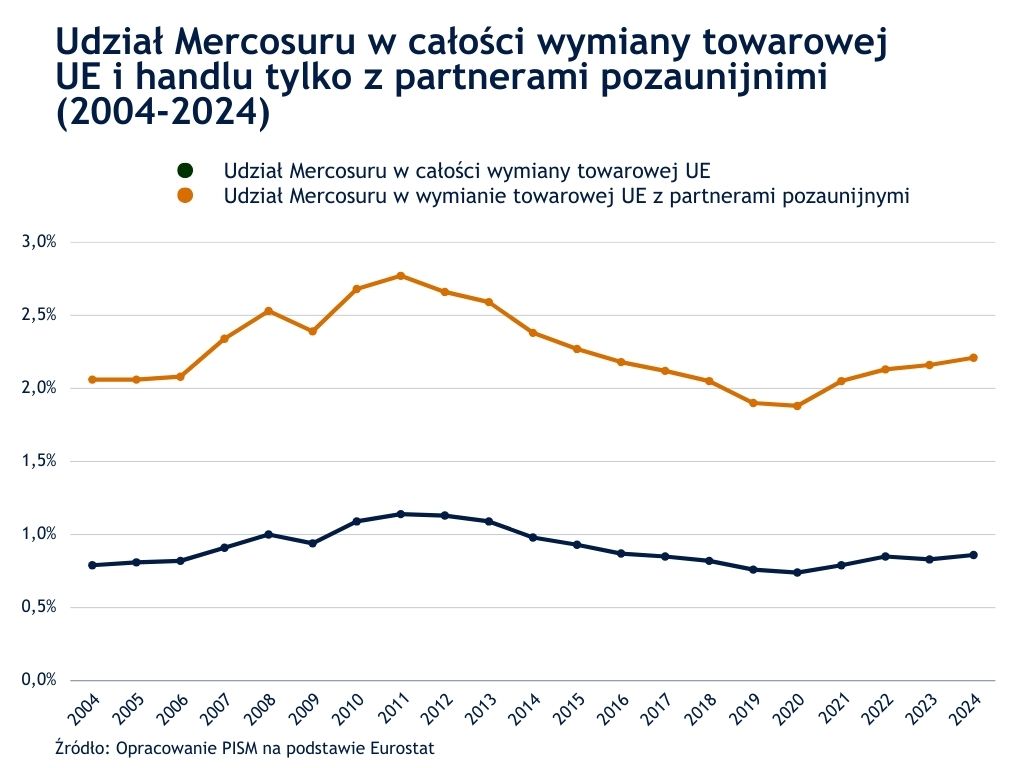 Narastający sprzeciw unijnych państw o silnych sektorach rolno-spożywczych przeciwko porozumieniu o partnerstwie z Mercosurem – wynegocjowanemu w grudniu ub.r. po prawie ćwierć wieku od rozpoczęcia rozmów – nie przeszkodził Komisji Europejskiej w podjęciu decyzji o zainicjowaniu ratyfikacji dokumentu. Zgodnie z przewidywaniami wydzieliła ona część handlową umowy (pozostałe to dialog polityczny i współpraca sektorowa) na podstawie kompetencji wyłącznych, więc do wyrażenia zgody wystarczy większość kwalifikowana w Radzie i zwykła w PE. Nie jest pewne, czy rządy Francji i Polski zdołają stworzyć koalicję, która mogłaby zablokować ten proces – według mediów Komisja próbuje wykluczyć taki scenariusz, m.in. oferując jakiś wewnętrzny mechanizm ochronny lub kompensacyjny. Przekonuje do umowy, kładąc nacisk na korzyści gospodarcze – głównym rezultatem ma być utworzenie największej na świecie strefy wolnego handlu (ponad 700 mln konsumentów). Jednak na determinację KE w przeforsowaniu porozumienia w dużym stopniu wpływa kontekst polityczny. Porozumienie z Mercosurem ma być odpowiedzią m.in. na narastający protekcjonizm USA oraz umacniającą się pozycję gospodarczą Chin w Ameryce Płd.