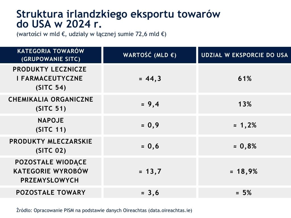 W lipcu przewodnicząca KE Ursula von der Leyen wynegocjowała z prezydentem USA Donaldem Trumpem porozumienie handlowe, w ramach którego UE zgodziła się na nałożenie przez USA 15-procentowych ceł na towary europejskie. Zabezpieczyło ono podstawowe interesy Irlandii, będącej czwartym największym eksporterem do Stanów Zjednoczonych w UE (z eksportem towarowym do USA w ub.r. o wartości 72,6 mld euro, przy wartości importu 22,5 mld euro). Dla eksportu Irlandii do USA kluczowy jest jednak sektor farmaceutyczny (obecnie leki stanowią 61% jego całkowitej wartości), z uwagi na zapowiadane przez Trumpa podniesienie ceł w tym zakresie do wielokrotności stawki podstawowej w celu relokacji ich produkcji do Stanów Zjednoczonych. Politycznie kwestia ta jest powiązana z wdrażaniem DSA. Na Irlandię – jako siedzibę europejskich oddziałów amerykańskich korporacji Big Tech (np. Google i Apple) – USA wywierają presję w celu osłabiania wdrażania dyrektywy, obejmującą groźby sankcji ekonomicznych oraz personalne przeciw kluczowym politykom. Niewdrożenie dyrektywy grozi jednak Irlandii sporem z KE, podobnie jak w przypadku opodatkowania koncernu Apple. W ub.r. Trybunał Sprawiedliwości UE ostatecznie zobowiązał Irlandię do wyegzekwowania od firmy dopłaty do nieuczciwie niskich podatków.