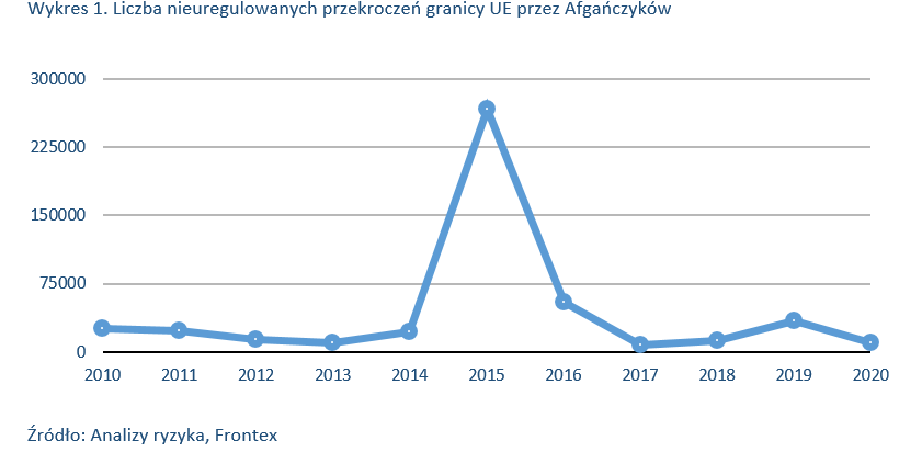 W efekcie wieloletnich wojen Afgańczycy stanowią dziś największą w Azji i trzecią największą na świecie grupę uchodźców, po Syryjczykach i Wenezuelczykach[1]. W ostatnich latach obywatele tego kraju wielokrotnie przedostawali się na terytorium UE w sposób nieuregulowany. Najczęściej korzystali przy tym ze szlaku wschodniośródziemnomorskiego, prowadzącego przez Turcję do Grecji. Rekordowy wzrost napływu Afgańczyków odnotowano w okresie kryzysu uchodźczo-migracyjnego w 2015 r., kiedy to liczba przypadków nielegalnego przekroczenia granicy UE była wyższa niż 200 tys. (zob. Wykres 1). W 2020 r. odnotowano ich łącznie ok. 10 tys., co stanowiło przeszło 8,1% wszystkich prób nieuregulowanego przekraczania granic. Większość osób nie przybyła bezpośrednio z Afganistanu, ale z państw trzecich (głównie Iranu, Pakistanu, Turcji), gdzie żyli już od pewnego czasu. Na ich decyzje migracyjne miała wpływ przede wszystkim pogarszająca się sytuacja gospodarcza i polityczna w tych państwach.