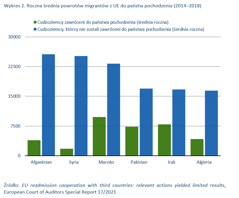 Pomimo zachęt finansowych efekty polityki powrotowej UE wobec Afgańczyków były ograniczone – w latach 2014–2018 realizowano rocznie średnio ok. 4 tys. ich powrotów do państwa pochodzenia. W tym samym czasie liczba osób, których nie udało się zawrócić, wynosiła przeszło 25 tys. rocznie (i była najwyższa w UE, zob. Wykres 2). Małe postępy skłoniły UE do podpisania z Afganistanem kolejnego porozumienia w kwietniu 2021 r. (Joint Declaration on Migration Cooperation, JDMC)[7], które miało ułatwić i przyspieszyć deportacje[8].