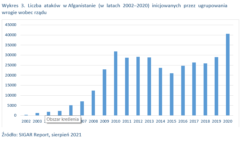 Sytuacja bezpieczeństwa pogarszała się w Afganistanie od kilku lat, szczególnie po zakończeniu misji wojskowej NATO i po wycofaniu większości wojsk międzynarodowych w grudniu 2014 r. Liczba wrogich ataków niemal podwoiła się między 2014 a 2020 r. (Wykres 3) a talibowie powoli przejmowali coraz większe terytorium. Według amerykańskiego ministerstwa obrony liczba dystryktów kontrolowanych lub będących pod wpływami afgańskiego rządu zmniejszyła się między 2015 r. a 2018 r. o 16%, do nieco więcej niż połowy kraju (56%)[10]. W 2018 r. talibowie sprawowali władzę już w 12% dystryktów, a 32% z nich była sporna. Dalszy wzrost kontroli talibów nie był już dokumentowany, gdyż Amerykanie zaprzestali podawania danych na ten temat.
