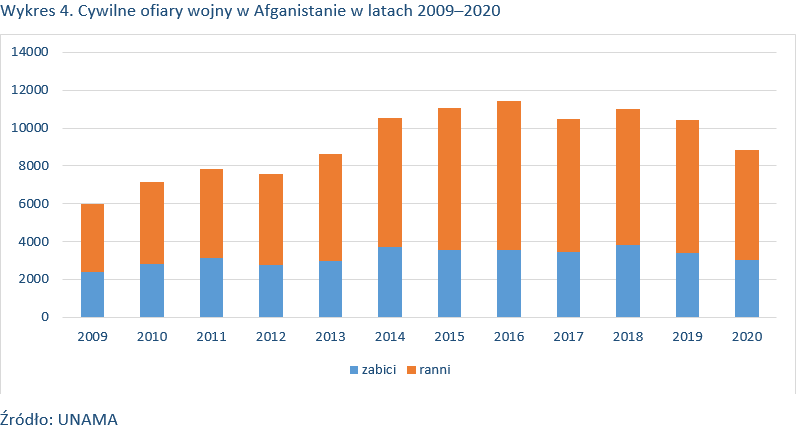 W efekcie intensywnych działań zbrojnych liczba ofiar cywilnych w Afganistanie stale rosła od 2009 r. do 2017 r, by nieco spaść w kolejnych latach (Wykres 4). W 2020 r. ponad 3 tys. Afgańczyków zginęło jednak w wyniku działań grup antyrządowych (62%) lub prorządowych (25%)[11]. W pierwszej połowie 2021 r. liczba ofiar dramatycznie wzrosła (o 47%) w stosunku do poprzedniego półrocza, co miało związek z finalną ofensywą talibów. W rezultacie tylko do sierpnia 2021 r. ponad 550 tys. osób uciekło ze swoich domów, zwiększając liczbę wewnętrznie przesiedlonych do 3,5 mln.
