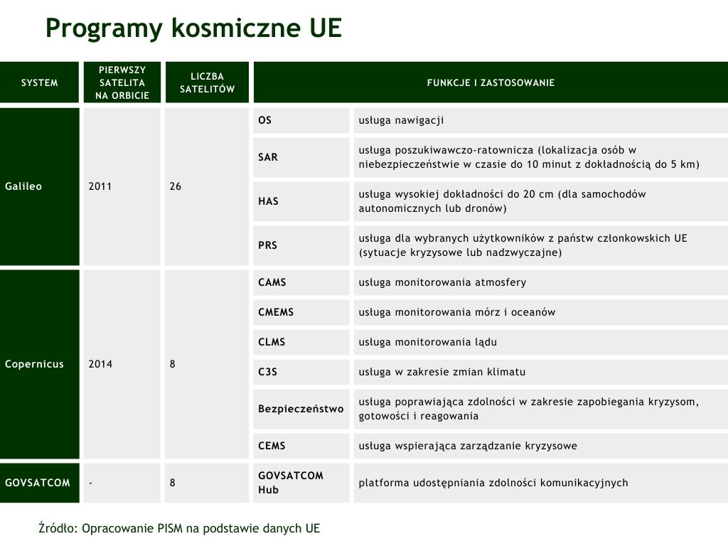 UE posiada jedne z najbardziej rozwiniętych na świecie systemów nawigacji (Galileo) oraz obserwacji Ziemi (Copernicus). Do tej pory nie stworzyła jednak systemu, który pozwalałby na bezpieczną i niezakłóconą komunikację satelitarną. Od kilku lat trwały prace nad GOVSATCOM, który uruchomiony został z końcem stycznia. Na obecnym etapie to platforma, która łączy we wspólną pulę osiem satelitów z pięciu państw – Francji, Hiszpanii, Włoch, Grecji i Luksemburga – i udostępnia je pozostałym członkom Unii. W kolejnych latach ma łączyć również satelity komercyjne, tak aby swoim zasięgiem pokrywać cały glob. Co do zasady GOVSATCOM będzie dostępny tylko dla wybranych użytkowników – rządów i wojsk – z państw członkowskich i organów UE, oferując bezpieczny i szyfrowany system komunikacji. Prawdopodobnie rozważane jest także przyznanie dostępu Ukrainie. GOVSATCOM ma charakter przejściowy– w 2029 r. ma zostać włączony w IRIS2, czyli budowaną obecnie przez UE konstelację 290 satelitów. W ten sposób Europa wzmocni swoje zdolności obronne i uzyska niezależny system globalnej komunikacji, dzięki któremu nie będzie musiała polegać np. na amerykańskich rozwiązaniach komercyjnych jak Starlink.