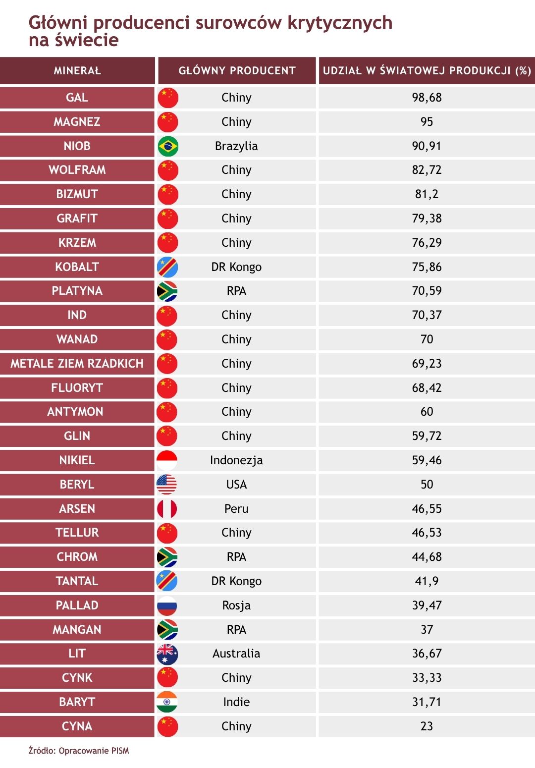 USA i Australia w porozumieniu podpisanym 20 października zadeklarowały m.in. współpracę w zakresie zabezpieczenia dostaw do USA, wykorzystując m.in. australijską rezerwę strategiczną, która ma powstać do połowy 2026 r. Ponadto podejmą inwestycje w wydobycie i przetwarzanie REE, dla których w ciągu 6 miesięcy utworzą fundusz o wartości minimum 2 mld dol. Usprawnią też formalne aspekty powyższych procesów, m.in. uzgodnienia dotyczące cen, uzyskiwanie zgód na wydobycie, a także współpracę z innymi państwami. Koordynacją współpracy ma się zajmować grupa ds. bezpieczeństwa dostaw surowców krytycznych pod kierownictwem sekretarza energii USA i australijskiego ministra ds. zasobów. Zawarte porozumienie jest jednym z instrumentów USA mających zmniejszać ich zależność od surowców krytycznych z Chin (obecnie import REE wynosi ponad 80%). Istniejące regulacje chińskie blokują możliwość ich pozyskiwania przez firmy sektora zbrojeniowego. Współpraca z Australią, która jest czwartym producentem REE na świecie, pomoże też w rywalizacji z Chinami o inwestycje w projekty surowcowe na świecie, jak i walce z chińską manipulacją cenami minerałów na rynkach światowych.
