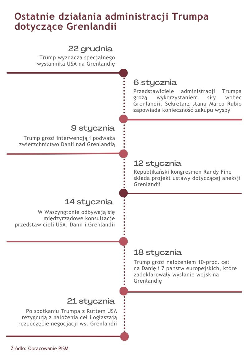 Spotkanie prezydenta Donalda Trumpa z sekretarzem generalnym NATO Markiem Ruttem 21 stycznia w Davos doprowadziło do chwilowej deeskalacji w relacjach USA z europejskimi partnerami i rozpoczęcia negocjacji w sprawie Grenlandii. Administrację Trumpa mają reprezentować wiceprezydent J.D. Vance, sekretarz stanu Marco Rubio i specjalny wysłannik Steve Witkoff. W efekcie USA nie nałożą zapowiedzianych wcześniej 10-procentowych ceł na Danię, Finlandię, Francję, Holandię, Niemcy, Norwegię, Szwecję i Wielką Brytanię, które miały zacząć obowiązywać 1 lutego. Tym bardziej UE nie wdroży środków odwetowych, choć Parlament Europejski zdążył zablokować ratyfikację porozumienia handlowego z USA z Turnberry, zawartego w lipcu ub.r. W wystąpieniu podczas Forum Ekonomicznego Trump zapowiedział, że nie użyje siły wobec Grenlandii, choć jednocześnie podkreślał konieczność uzyskania kontroli nad wyspą. Z tego powodu nadal należy rozważać jako prawdopodobne różne scenariusze podejścia USA – od dążenia do zakupu wyspy, ustanowienia autonomii Grenlandii i następnie zawiązania porozumienia z jej władzami o zwierzchnictwie USA, po wykorzystanie środków wojskowych do przejęcia wyspy. Brak postępów w negocjacjach może skłaniać administrację Trumpa do ponownego użycia gróźb ekonomicznych. Ich ewentualna nieskuteczność, w tym proporcjonalna odpowiedź UE, może stanowić dla władz USA argument za koniecznością wymuszonego przejęcia kontroli nad Grenlandią.