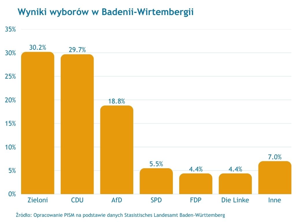 Duże znaczenie wyborów w Badenii-Wirtembergii wynika z jej potencjału ludnościowego (ponad 11 mln osób) i ekonomicznego (wielkość PKB – ok. 650 mld euro), które plasują ją jedynie za Nadrenią-Północną Westfalią i Bawarią. Podstawą jej gospodarki jest silny przemysł (znajdują się tam m.in. siedziby Mercedesa, Porsche i Boscha). Dlatego głównym tematem kampanii wyborczej była trudna sytuacja ekonomiczna i problemy przedsiębiorstw, np. zapowiedzi redukcji zatrudnienia w części z nich. Na społeczne obawy przed dezindustrializacją i bezrobociem najskuteczniej odpowiedzieli Zieloni. Ich kandydat na premiera landu, Cem Özdemir, wbrew poglądom części działaczy opowiedział się za wsparciem finansowym dla przemysłu i kontynuowaniem produkcji aut z silnikiem spalinowym. Przegrana CDU wynikała zarówno z niezadowolenia z dorobku gabinetu kanclerza Friedricha Merza (poparcie dla rządu wynosi 22%), jak i z błędów jej kandydata Manuela Hagela, którego wypowiedzi część wyborców mogła uznać za seksistowskie i aroganckie. Trzecie miejsce Alternatywy dla Niemiec (AfD, 18,8%) wskazuje, że zyskuje ona coraz silniejszą pozycję także na zachodzie państwa. Najgorszy wynik w historii odnotowała Socjaldemokratyczna Partia Niemiec (SPD, 5,5%), która straciła poparcie m.in. pracowników przemysłu (na rzecz Zielonych, CDU i AfD). Podobnie jak w wyborach do Bundestagu, 5-procentowego progu wyborczego nie przekroczyła Wolna Partia Demokratyczna (FDP), co jest potwierdzeniem jej marginalizacji.