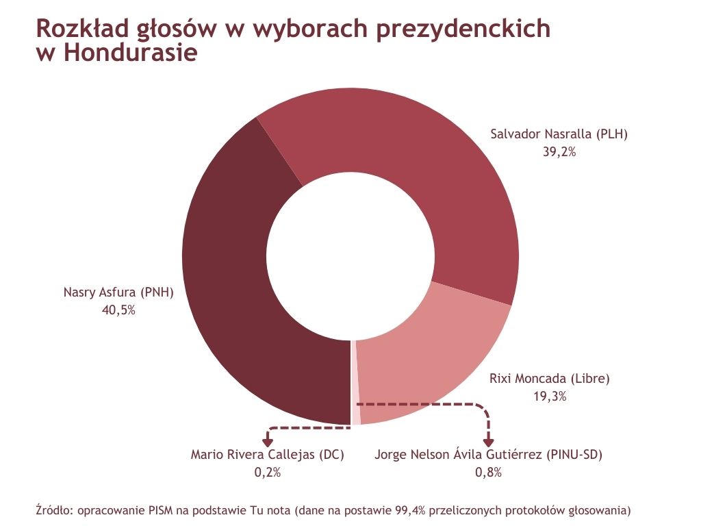 Na podstawie 99,4% protokołów wyborczych przeliczonych do 9 grudnia br. Rixi Moncada z rządzącej partii Libre uzyskała 19,29% głosów, Salvador Nasralla z PLH 39,20%, a Nasry Asfura z PNH 40,52%. Przerwanie liczenia głosów przez Krajową Radę Wyborczą w dniach 5–8 grudnia, tłumaczone usterką techniczną, wzmocniło – nasilone już podczas kampanii – wątpliwości co do uczciwości procesu wyborczego. Nie wiadomo, w jakim stopniu na wynik Asfury wpłynęły poparcie udzielone mu przez Donalda Trumpa na kilka dni przed głosowaniem oraz groźba wstrzymania pomocy finansowej dla Hondurasu w razie jego przegranej. Niejasny był też cel i efekt ogłoszonej jednocześnie decyzji prezydenta o ułaskawieniu Juana Orlando Hernándeza – wywodzącego się z PNH przywódcy Hondurasu w latach 2014–2022 – odsiadującego w USA karę 45 lat więzienia za kierowanie grupą odpowiedzialną za przemyt ponad 400 ton kokainy. Decyzja Trumpa nie tylko podważa wiarygodność polityki antynarkotykowej jego administracji, ale też dowodzi, że jest on gotowy wesprzeć polityków skazanych za ciężkie przestępstwa, o ile traktuje ich jako swoich ideologicznych sojuszników. Partia Libre domaga się anulowania wyborów, jako główny powód podając ingerencję USA.