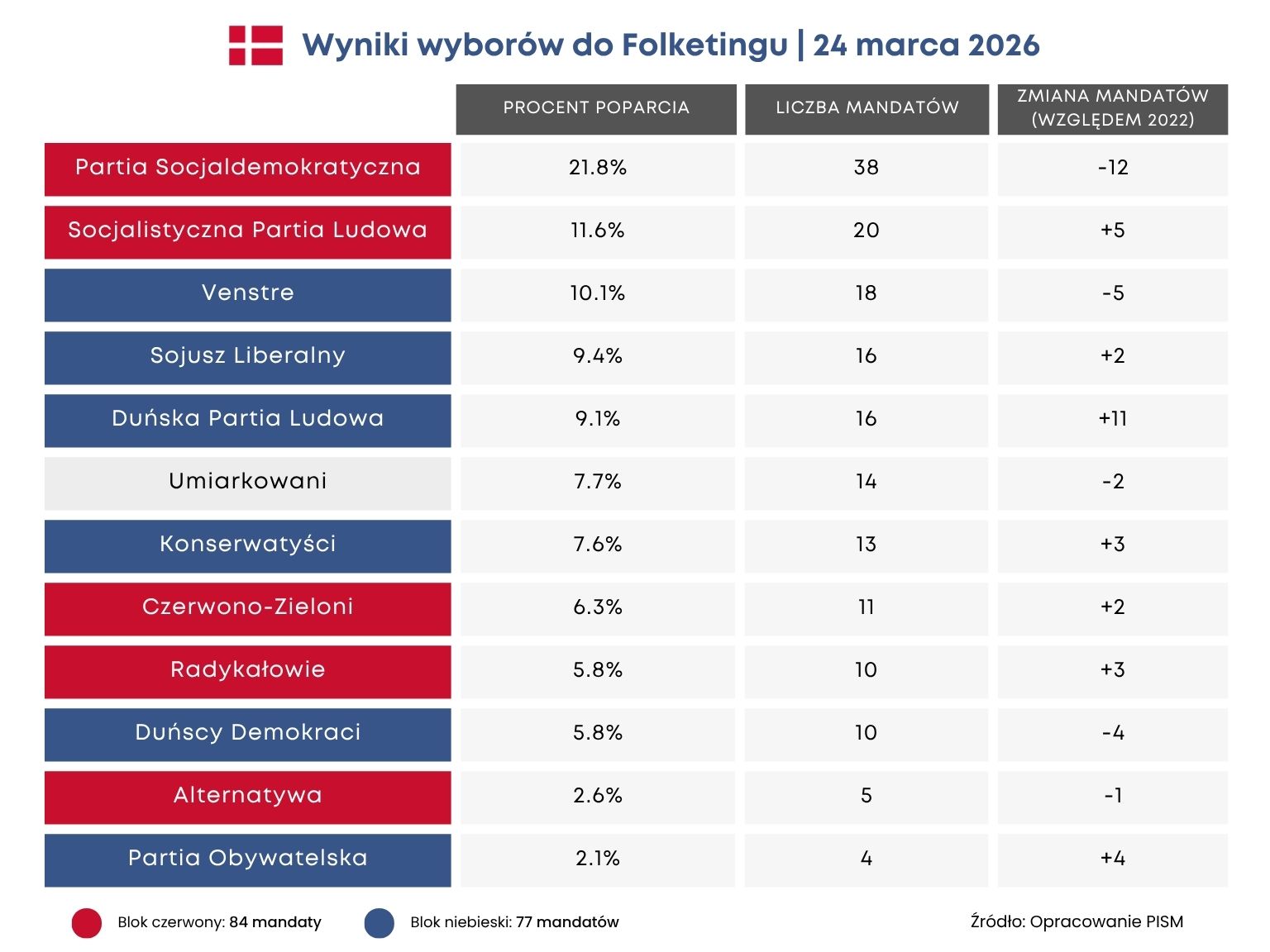 Brak uzyskania większości 90 mandatów przez jeden z głównych bloków politycznych – czerwony, którego trzonem jest PS, bądź niebieski centroprawicowy – wynika z rozdrobnienia politycznego. Dzięki 2-procentowemu progowi wyborczemu do Folketingu ponownie dostało się 12 ugrupowań, co oznacza żmudne negocjacje koalicyjne (po wyborach w 2022 r. trwały one 42 dni). Rezultat wyborów wzmacnia pozycję negocjacyjną centrowych Umiarkowanych dotychczasowego ministra spraw zagranicznych i byłego premiera Larsa Løkke Rasmussena. Wynik wyborów świadczy o niewystarczającym zagospodarowaniu poparcia społecznego dla wysiłków rządu przeciwdziałających przejęciu Grenlandii przez USA. Chociaż do zwycięstwa pełniącej od 2019 r. funkcję premiera Mette Frederiksen przyczyniła się jej zdecydowana postawa w tej sprawie, to skupienie się wyborców na kwestiach wewnętrznych, w tym kosztach życia, poskutkowało utratą poparcia i 12 mandatów przez PS. Dzięki ponadpartyjnemu konsensusowi wynik wyborów parlamentarnych w znaczący sposób nie zmieni głównych założeń polityki bezpieczeństwa i zagranicznej. W praktyce oznacza to dalsze wspieranie Ukrainy – także to militarne, podkreślanie sprawowania suwerenności nad Grenlandią oraz bliską współpracę z pozostałymi państwami nordyckimi, także w ramach Rady Państw Morza Bałtyckiego.