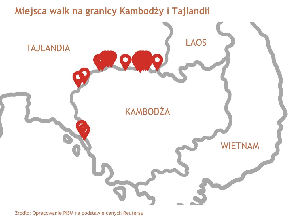 Po obu stronach zginęło dotychczas przynajmniej 14 osób (żołnierzy i cywilów), a 88 zostało rannych. Ponadto ok. 400 tys. mieszkańców Tajlandii i ok. 100 tys. Kambodży zostało ewakuowanych z terenów przygranicznych. Obie strony oskarżają się o eskalację walk. Ma ona prawdopodobnie związek z zarzucaniem przez Tajlandię stronie kambodżańskiej rozmieszczania nowych min wzdłuż spornej granicy (podobnie było w czasie lipcowych starć). Już 11 listopada, po wybuchu miny, która raniła tajlandzkiego żołnierza, władze Tajlandii zawiesiły wykonywanie umowy z końca października br. o wdrażaniu zawieszenia broni, podpisanej na szczycie ASEAN-u w Kuala Lumpur w obecności prezydenta USA Donalda Trumpa. W wyniku starć Kambodża wycofała swoją reprezentację z igrzysk Azji Południowo-Wschodniej, odbywających się w Tajlandii. Oba państwa wyrażają gotowość do obrony swojej suwerenności, a szef tajlandzkiej dyplomacji stwierdził, że nie ma przestrzeni do negocjacji z Kambodżą. Może to oznaczać przedłużenie walk, jednak ich przekształcenie się w długotrwałą wojnę na dużą skalę jest mało prawdopodobne z uwagi na potencjalne koszty ludzkie, polityczne i ekonomiczne. Elementami zaostrzającymi spór mogą być m.in. rozbudzone nastroje nacjonalistyczne po obu stronach, a także twarda postawa rządu Tajlandii w obliczu planowanych wyborów parlamentarnych, które mają odbyć się na początku 2026 r. Prawdopodobnie naciski na oba państwa w celu zakończenia walk będą wywierać USA, np. przez groźbę podwyższenia ceł, jak działo się to w lipcu (prezydent Trump ma rozmawiać z przywódcami Tajlandii i Kambodży).