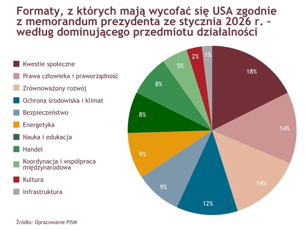 Administracja USA zapowiedziała też opuszczenie części formatów wielostronnych po tym, jak już w 2025 r. podjęła decyzję o wyjściu z WHO i UNESCO. W styczniu prezydent Trump ogłosił wycofanie USA z 66 OM, w tym z 31 powiązanych z ONZ, i zapowiedział dalsze podobne kroki. Do kluczowych opuszczanych formatów należą instytucje zajmujące się kwestiami energetyczno-klimatycznymi: Ramowa konwencja Narodów Zjednoczonych w sprawie zmian klimatu, Międzyrządowy Zespół ds. Zmian Klimatu (IPCC) i Międzynarodowa Agencja Energii Odnawialnej (IRENA). Sygnałem niechęci do formuły operacji pokojowych ONZ, prawa międzynarodowego i wspierania praworządności jest z kolei wycofanie się m.in. z prac Komisji i Funduszu Budowania Pokoju oraz Komisji Prawa Międzynarodowego (ILC) i Komisji Weneckiej. Poza tym USA mają opuścić głównie instytucje zajmujące się zrównoważonym rozwojem (jak Konferencja Narodów Zjednoczonych ds. Handlu i Rozwoju, UNCTAD), ochroną środowiska (Międzynarodowa Unia Ochrony Przyrody, IUCN) i kwestiami społecznymi (np. UN Women, Fundusz Ludnościowy ONZ). Poza wymienionymi i kilkoma innymi zdecydowana większość formatów realnie odgrywa niewielką rolę w poszczególnych sferach i opuszczenie części z nich jest zrozumiałe z perspektywy oszczędności budżetowych.